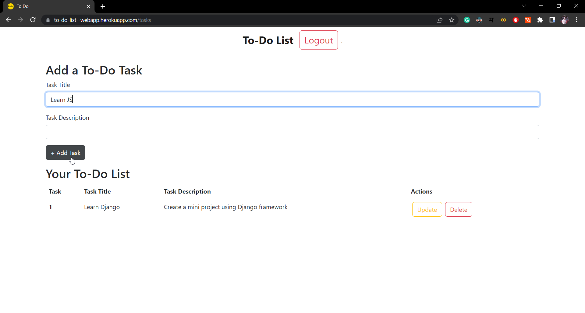 To-Do List Web-App using Flask-SQLAlchemy & Bootstrap Web App that lets User Create their To-Do Tasks List and lets them Update, Delete or Display all their Tasks To-Do List Web-App Here are some previews of the web app: