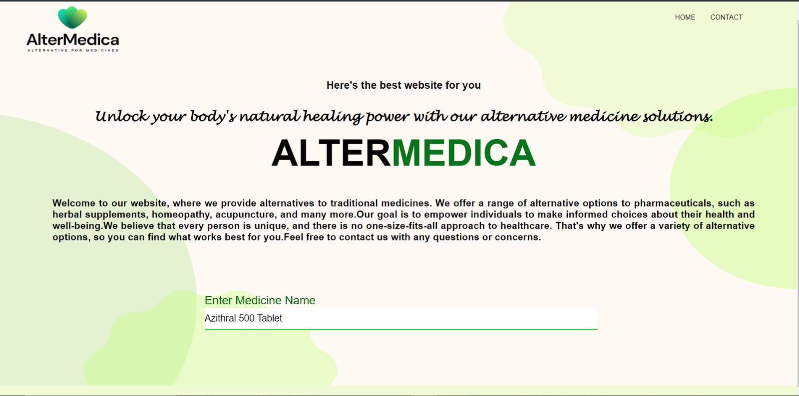 The “ALTERMEDICA” has been developed to provide accurate and up-to-date information on alternative medicines and therapies.Main goal of “ALTERMEDICA” is to provide alternatives to traditional medicines. We understand that many people prefer to use natural remedies and holistic approaches to health and wellness. That's why we offer a range of alternative options to pharmaceuticals, such as homeopathy, alopathy,acupuncture, and more.Our goal is to empower individuals to make informed choices about their health and well-being. We believe that every person is unique, and there is no one-size-fits-all approach to healthcare. That's why we offer a variety of alternative options, so you can find what works best for you. The website could serve as a valuable resource for those who are seeking alternative treatments for various medicines, or who may be looking to supplement their existing medical treatments with other remedies. The application is reduced as much as possible to avoid errors while entering the data. It also provides error message while entering invalid data. No formal knowledge is needed for the user to use this system. Thus by this all it provides it is user-friendly.