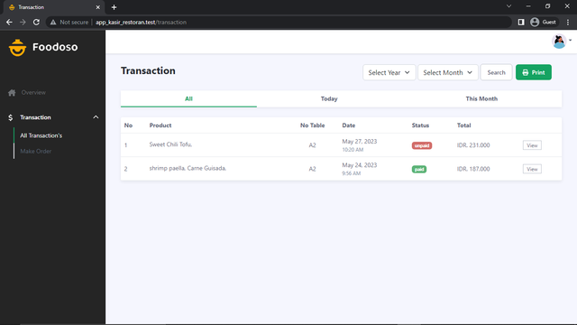 - Melakukan transaksi penjualan dengan input produk, kuantitas, dan meja.