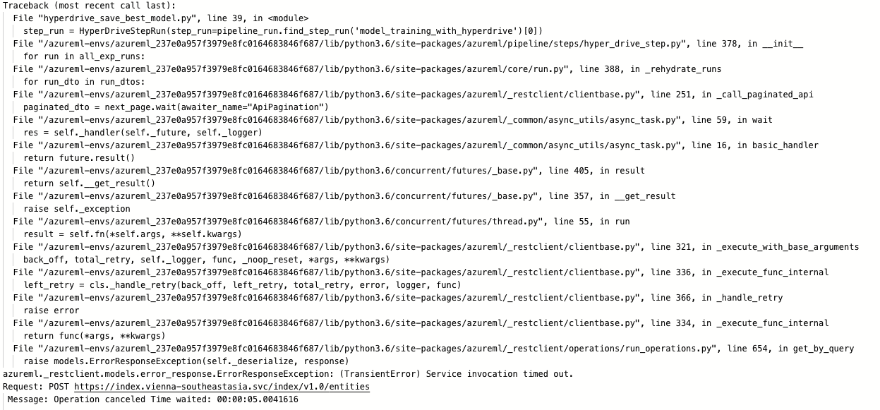 I'm facing an issue with HyperDriveStepRun. Have been using HyperDriveStepRun to retrieve the best model in a pipeline. However it's recently been throwing a Service invocation timed out error. Somewhat puzzled as the same pipeline was working in previous runs. The last I ran the pipeline was in Mar 2021 so was expecting it to work. Would you have any idea what the error means?