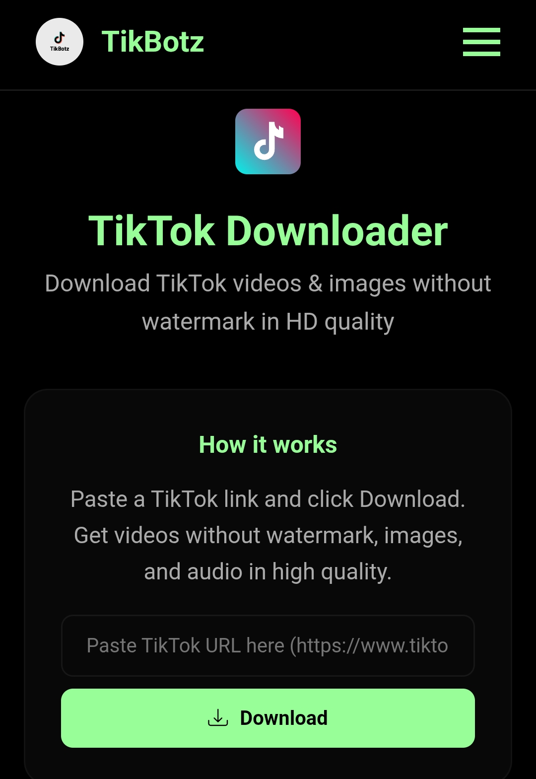 A fast, responsive, and easy-to-use TikTok downloader web application that allows you to download TikTok videos without watermark, images, and audio in high quality.