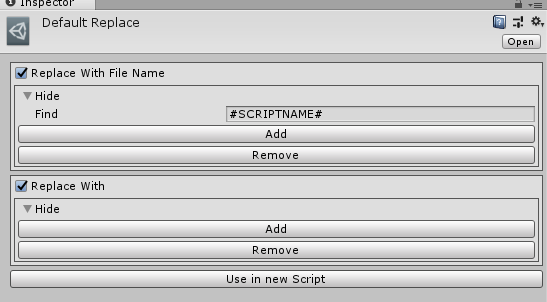 Default replace settings for scripts (replace with file name and/or custom string)
