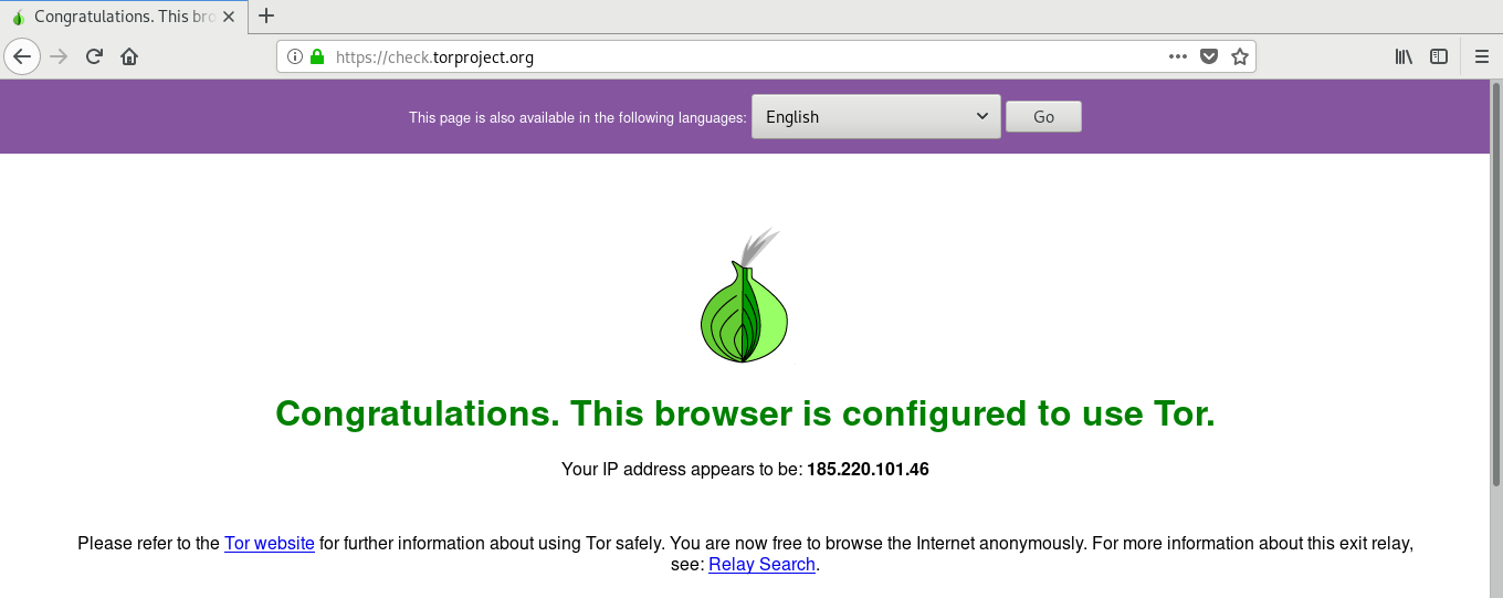 - Ip hidden and TOR network configured: Visit https://check.torproject.org, you should see a message like it: