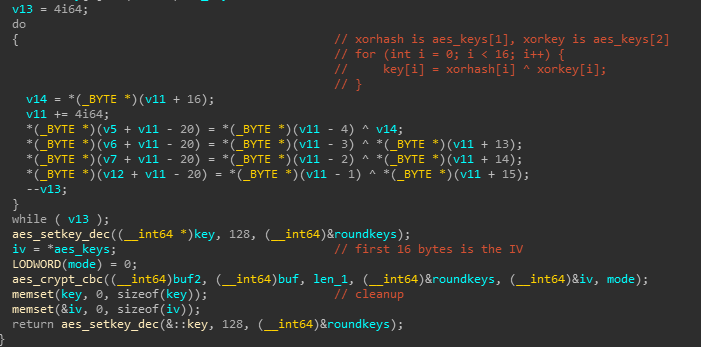which is quite easy to recognize it being AES. Easiet way to find the keys here would again be placing breakpoints and inspecting the arguments (especially the second arg, RDX).