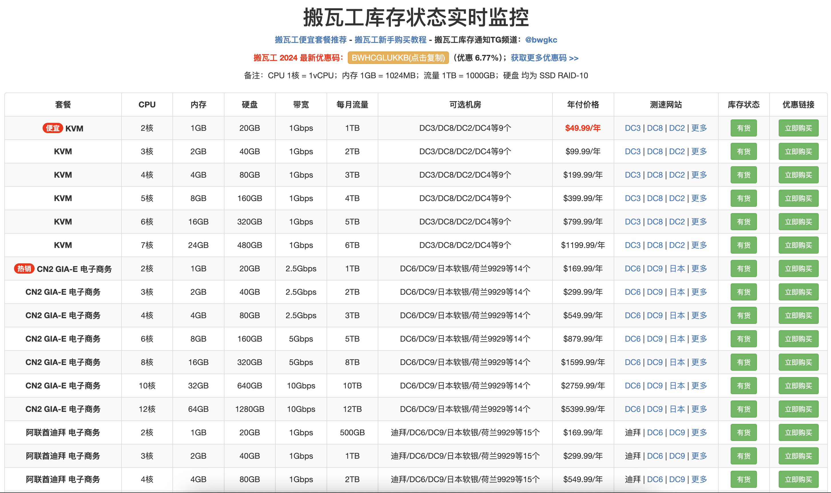 因为搬瓦工套餐的日常价格是比较贵的,大家购买会非常的不划算,但是搬瓦工的优惠套餐又不是经常有,所以想要实时知道搬瓦工的库存情况,搬瓦工库存监控 bwgkc.com 就可以帮助大家解决所有的问题