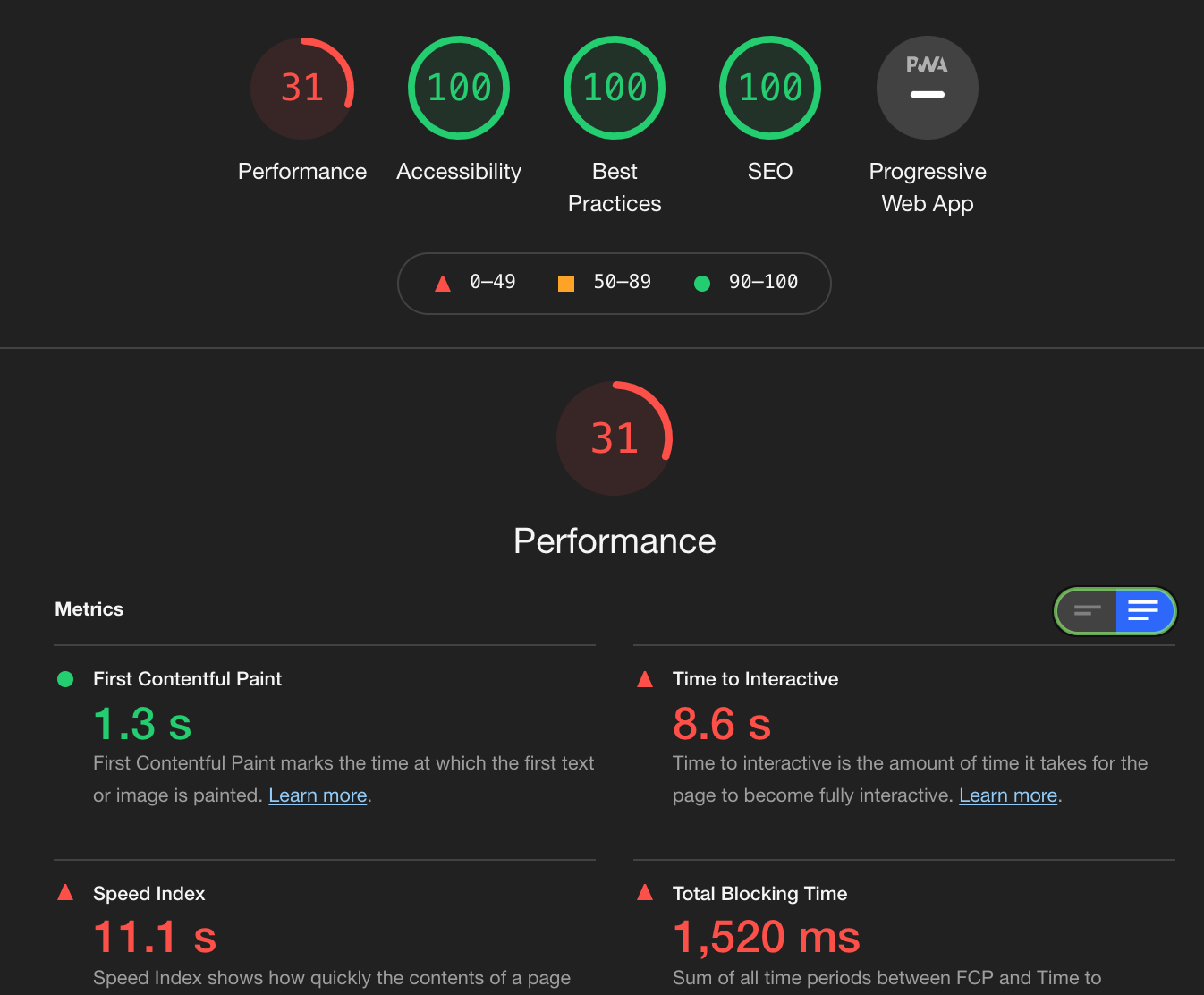 It's not single handedly bringing down your performance score, but it does appear to be a factor. Lighthouse actually considers the page to be loaded before any of the images show up, so it's only considering the animation on the title element. The animation on your title element is affecting the LCP. The LCP event is at the end of the animation that changes the size of the underline. If I manually remove that animation, the LCP event moves to the end of the fade-in animation. This is probably WAI, but is related to #10869. The high TBT, TTI, and CLS seem unrelated to the animation but have a high impact on the performance score. |