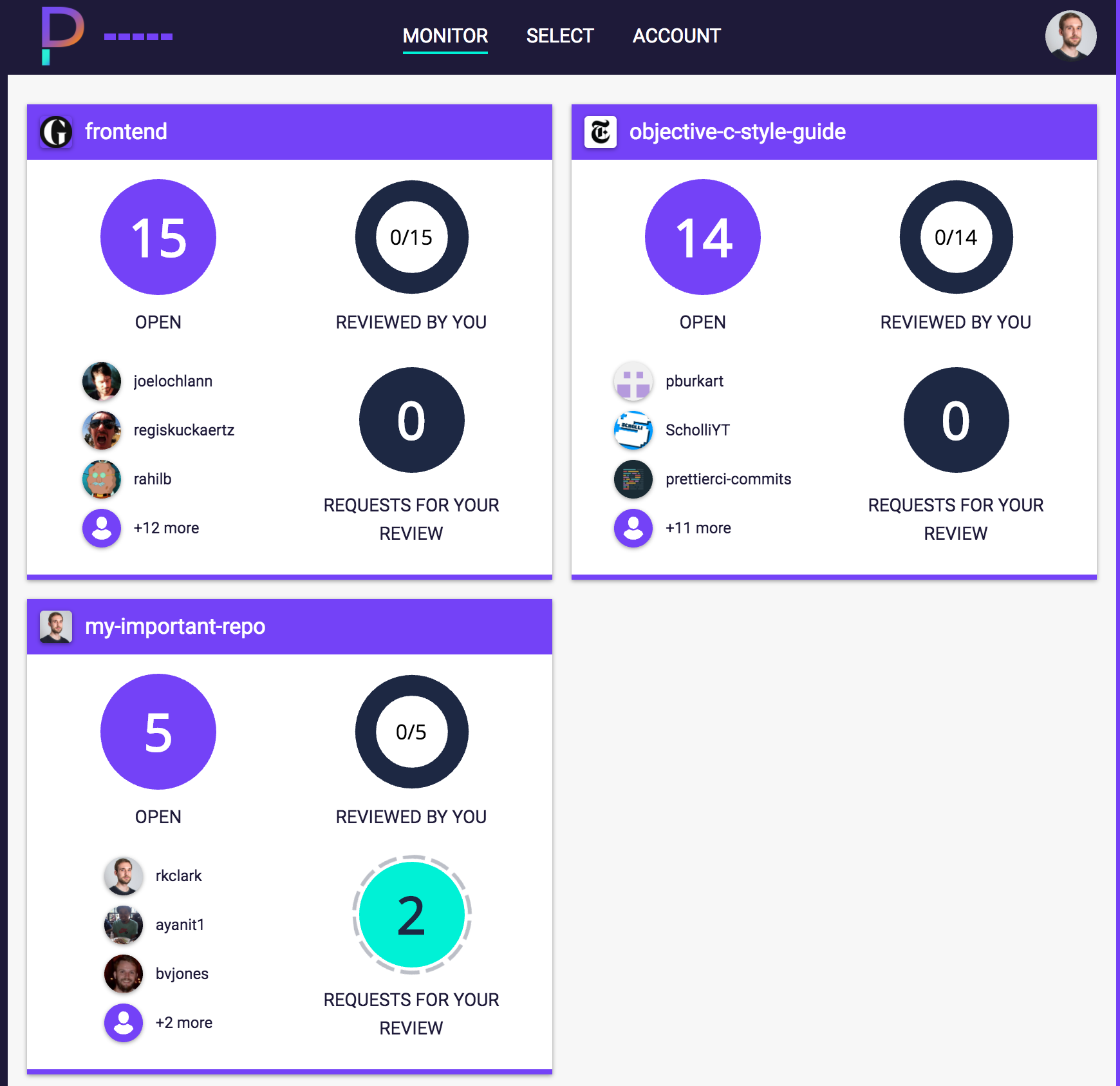 An interactive dashboard shows all the open pull requests for your chosen repositories and highlights where your review has been requested. This information syncs with Github every minute!
