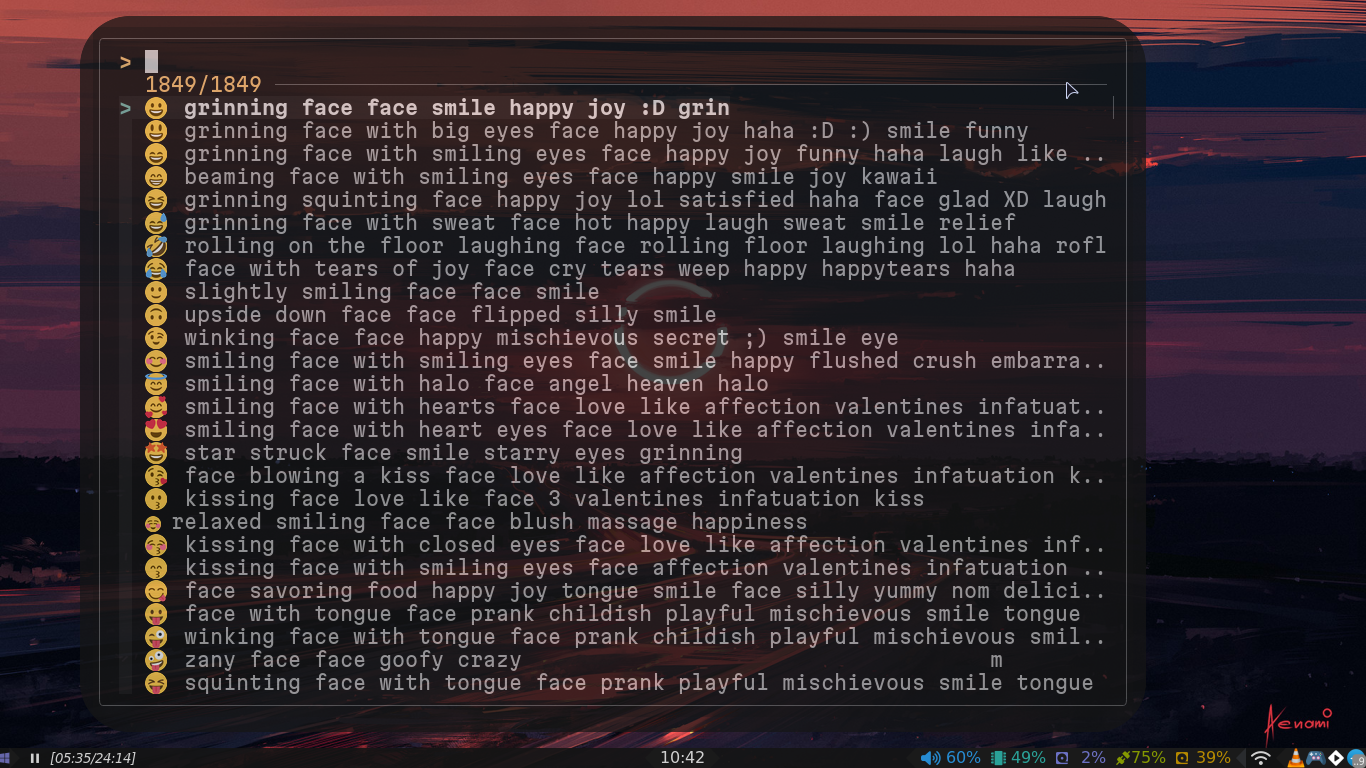 pressing the Microsoft keyboard's emoji key](https://support.microsoft.com/en-us/topic/use-microsoft-ergonomic-keyboard-c917dad0-3797-d97b-efb3-fbe27ac9703c#ID0EDFBBDDD) (Super-Ctrl-Alt-Shift-Space) triggers an emoji picker using fuzzy picker fzf.