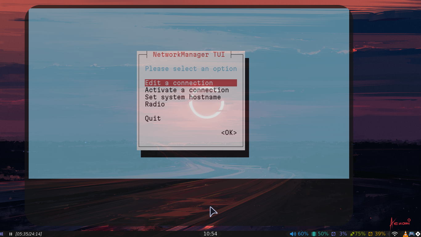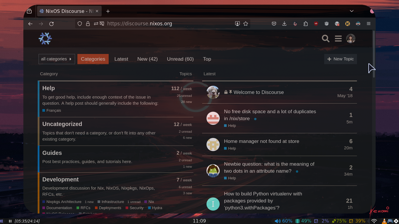 niri: see./home-manager/kiara/niri.nix(TODO)swaynotificationcenterfirefox(vimium-c)yazi(custom)wezterm(overrides:./home-manager/kiara/wezterm.nix)vscodium(overrides:./home-manager/kiara/vscode.nix)helix(overrides:./home-manager/kiara/features/text/helix.nix)neovimzshgumzathura