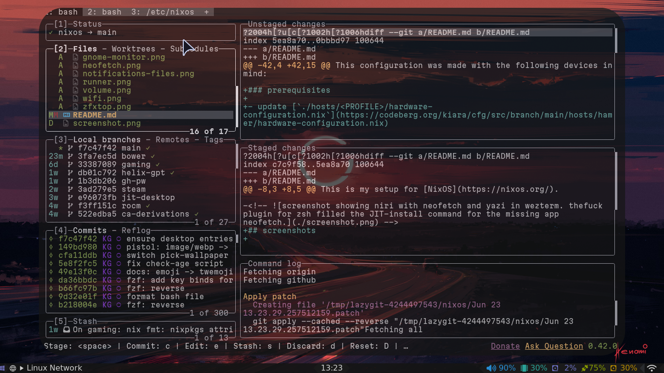 lazygit, offering a terminal-based way to work with Git repositories, including vim keybindings. helix, featuring language servers for nix (thrunixd) and others- a shell, using Zsh and decorated using