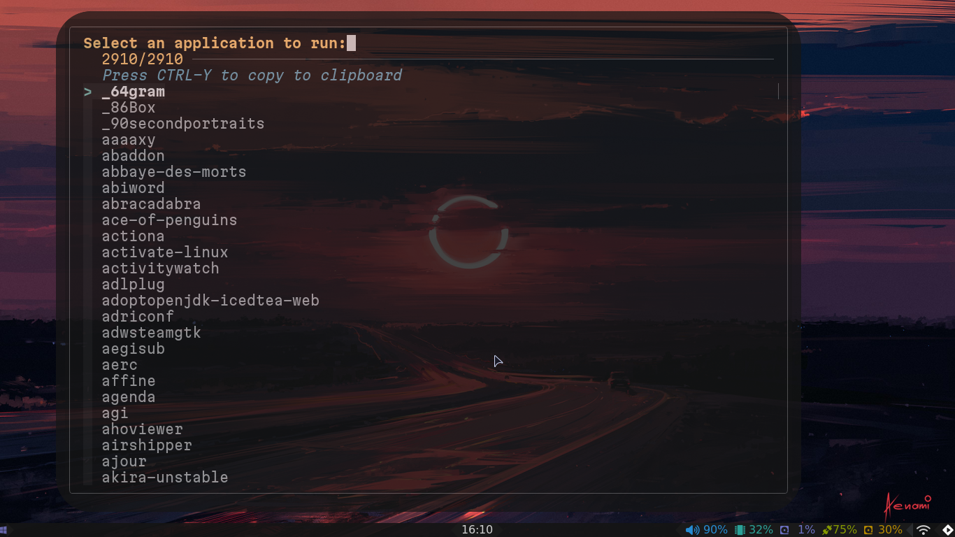 Application menu anyrun can be opened using Super+Space or by left-clicking the 'Windows' button.