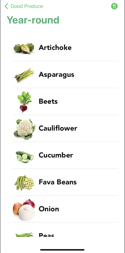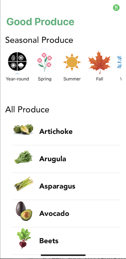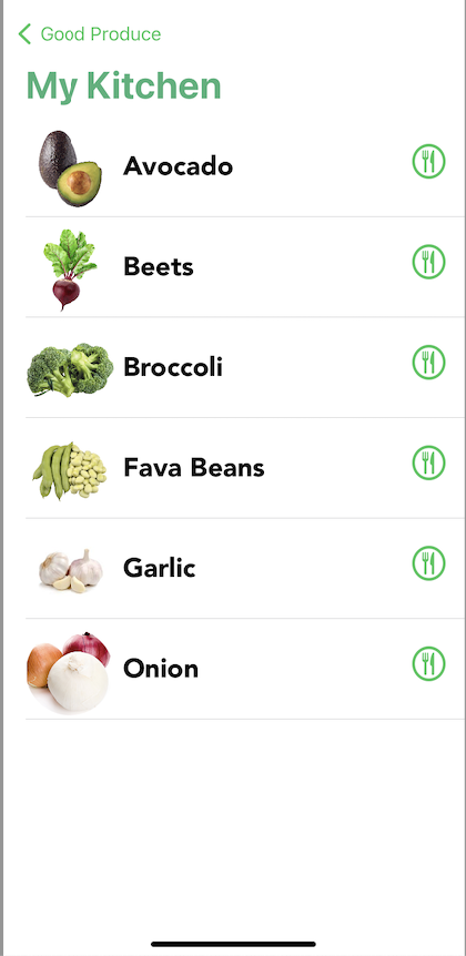 Initial Home Screen with: List of All Produce and seasonal selection option Access to "My Kitchen" (cutlery icon)