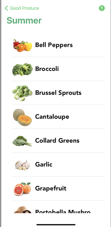 This repo contains the final project for the Mobile Software Engineering course MPCS 51039. The app provides users with a simple interfase to create a list of produuce items they currently have at home and are pending to eat. The Home Screen shows a list of produce and an option to view a seasonally filtered list. The app shows produce season and recommendations for storage. A user can easily add new items from any screen in the apap to "My Kitchen", where htey can view what they have at home and remove any items consumed.
