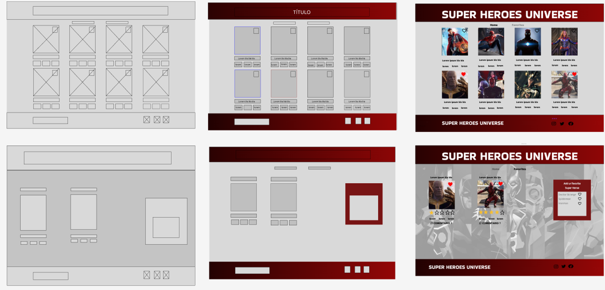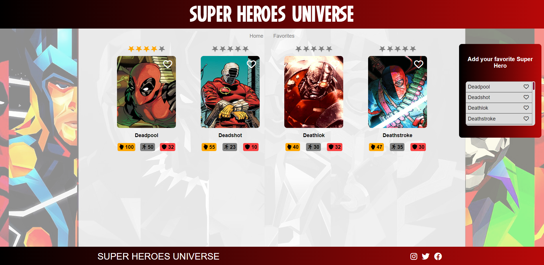 - Homepage con su header, footer y sección principal con la lista de los elementos los cuales podrán ser agregados a la vista de favoritos