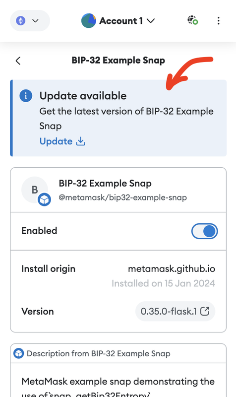 How can I implement the 'Update available' notification similar to the example (Update Snap) demonstrated in the Metamask Snaps latest tests: https://metamask.github.io/snaps/test-snaps/latest/