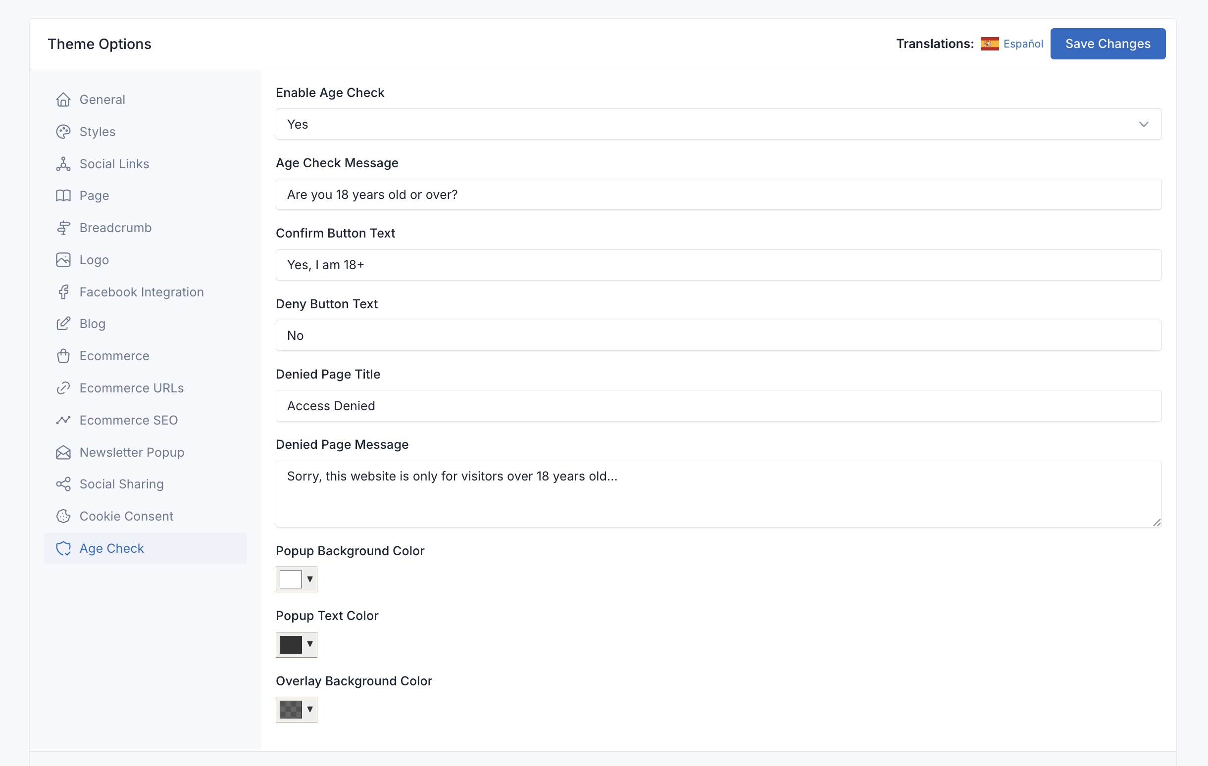 php artisan plugin:activate age-checkto activate the plugin. - Configure messages and colors via Appearance > Theme Options > Age Check.