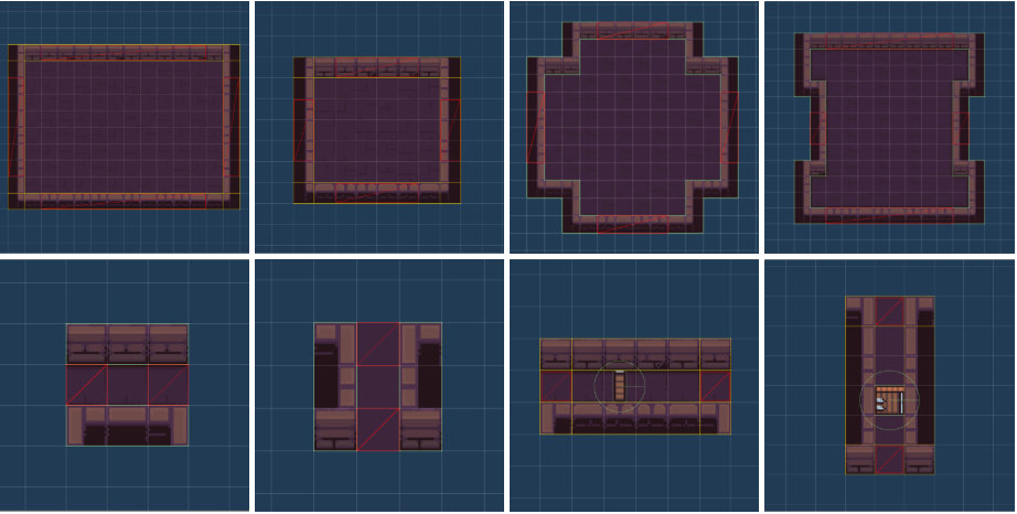 The appearance of individual rooms is controlled with so-called room templates. These are pre-authored building blocks from which the algorithm chooses when generating a level. They are created with Unity tilemaps, but they can also contain additional game objects such as lights, enemies or chests with loot. You can also assign different room templates to different types of rooms. For example, a spawn room should probably look different than a boss room.