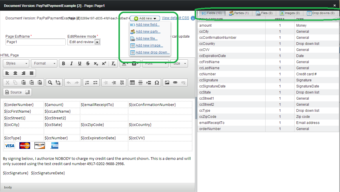 The document page editor should be familiar, except that now the fields, parties, files, images and drop down lists on the right panel are individually behind tabs. Just click on the appropriate tab to see the respective lists.