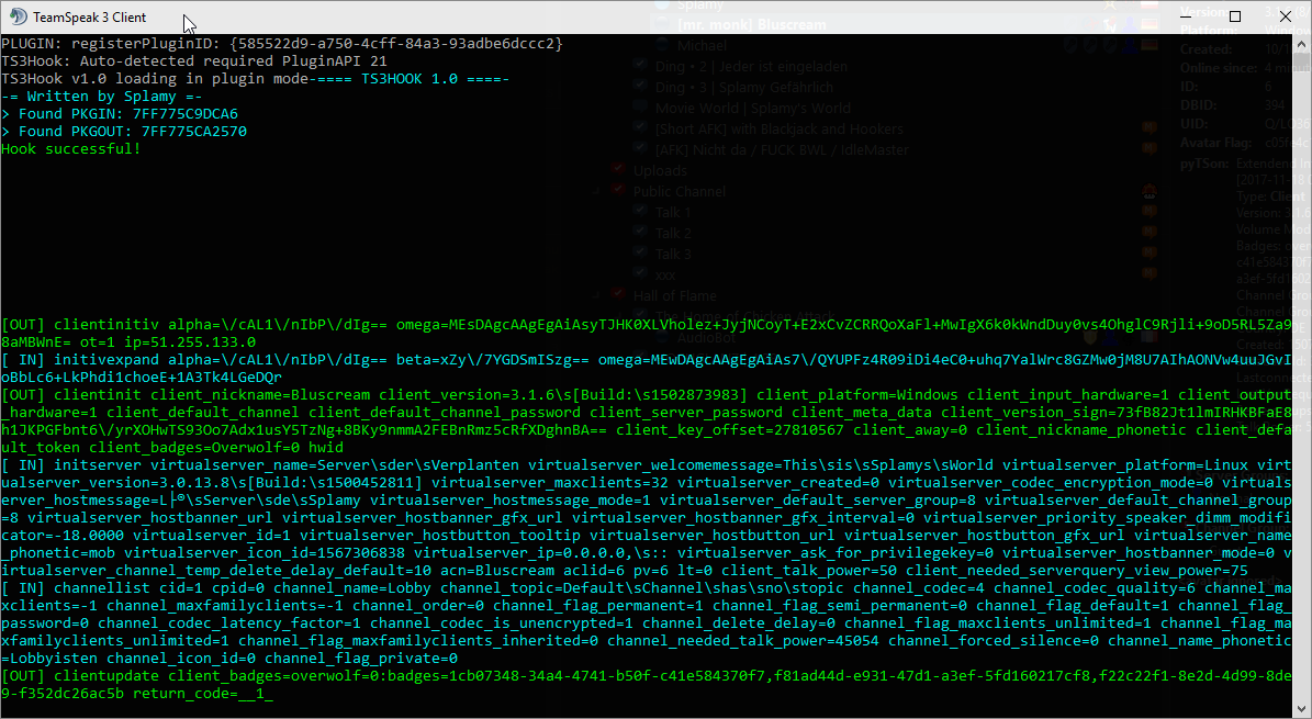 This is a TS3Client Plugin that decrypts Teamspeak 3 command packets on the fly and displays them in Teamspeak's own Console.