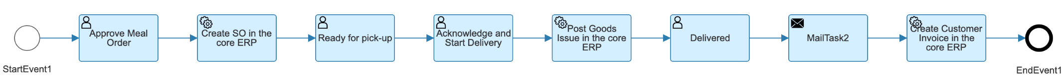 It implements an end-to-end process of Food Ordering solution, from customer ordering to the delivery confirmation. Such process is handled by the Workflow Management Service.