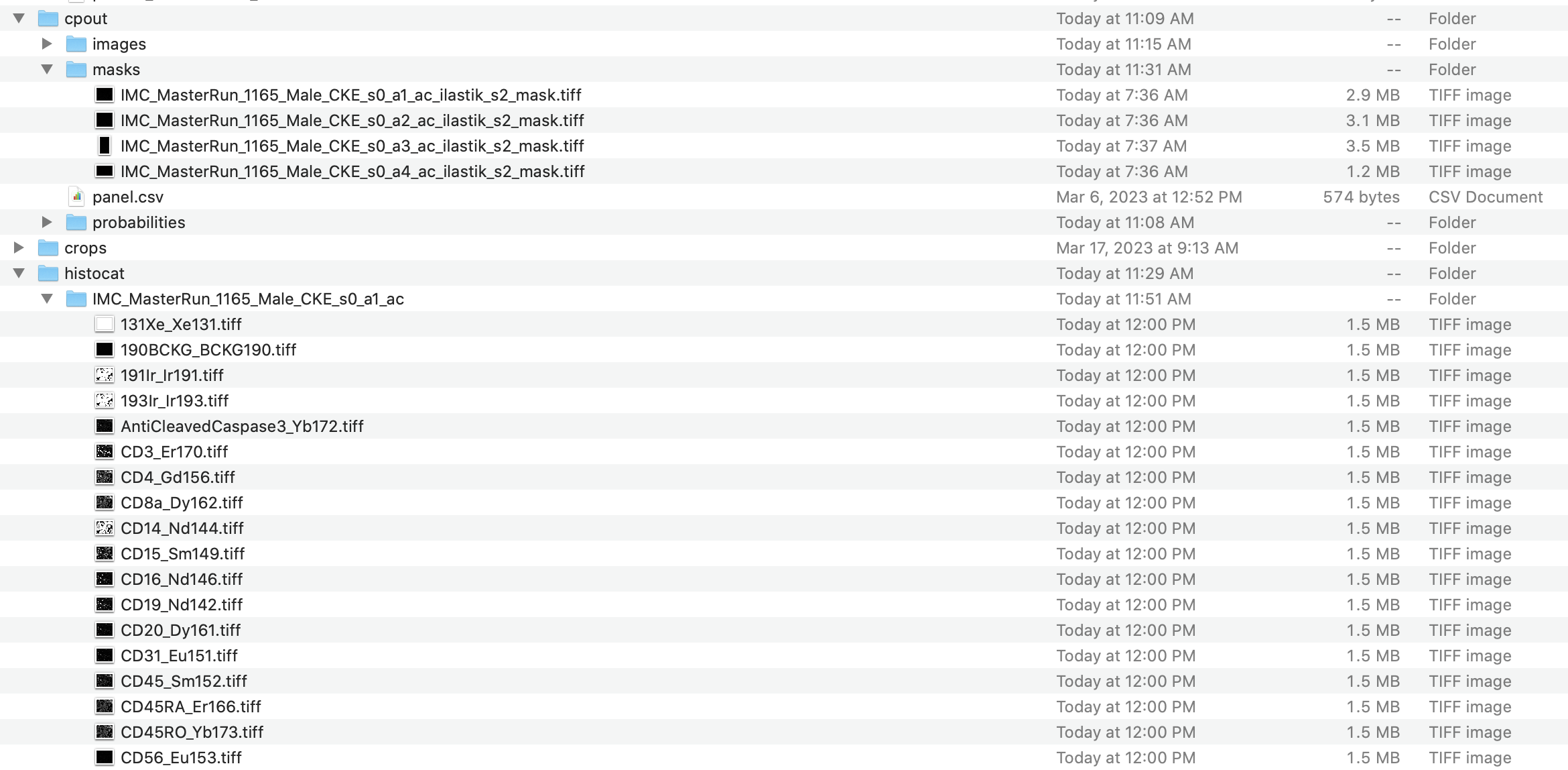 I have attempted to generate "the histocat folder with masks" portion of the imc_preporcessing script on JupyterNotebooks multiple times but to no avail. Whenever I run the chunk, all the .tiff files contained within each subfolder of the general histocat folder update but the masks files are not. I have tried to tried manually moving the mask files into the corresponding folders and re-running the chunk but the same thing happens. Only the .tiff files update and the mask files remain the same. As a result, histocat has been unable to load the histocat subfolders when they contain the mask files and only load the subfolders when I manually remove the mask files. I see that the chunk is calling the final_masks_dir which contains the mask files when it runs but they do not update. If you could let me know, what format the files are converted to when imcsegpipe.export_to_histocat is applied so I can manually change each mask or help me understand why this is happening, I would greatly appreciate it.