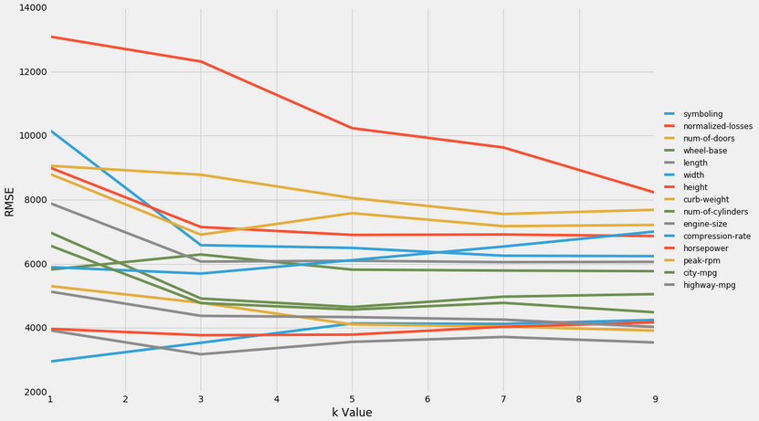 ['engine-size', 'width', 'horsepower', 'highway-mpg', 'curb-weight']. - A k-value of 3 or less should be used to minimize the root mean squared error value.