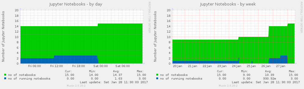 jupyter-munin shows you the amount of Jupyter notebooks and the number of running Jupyter notebooks on your server