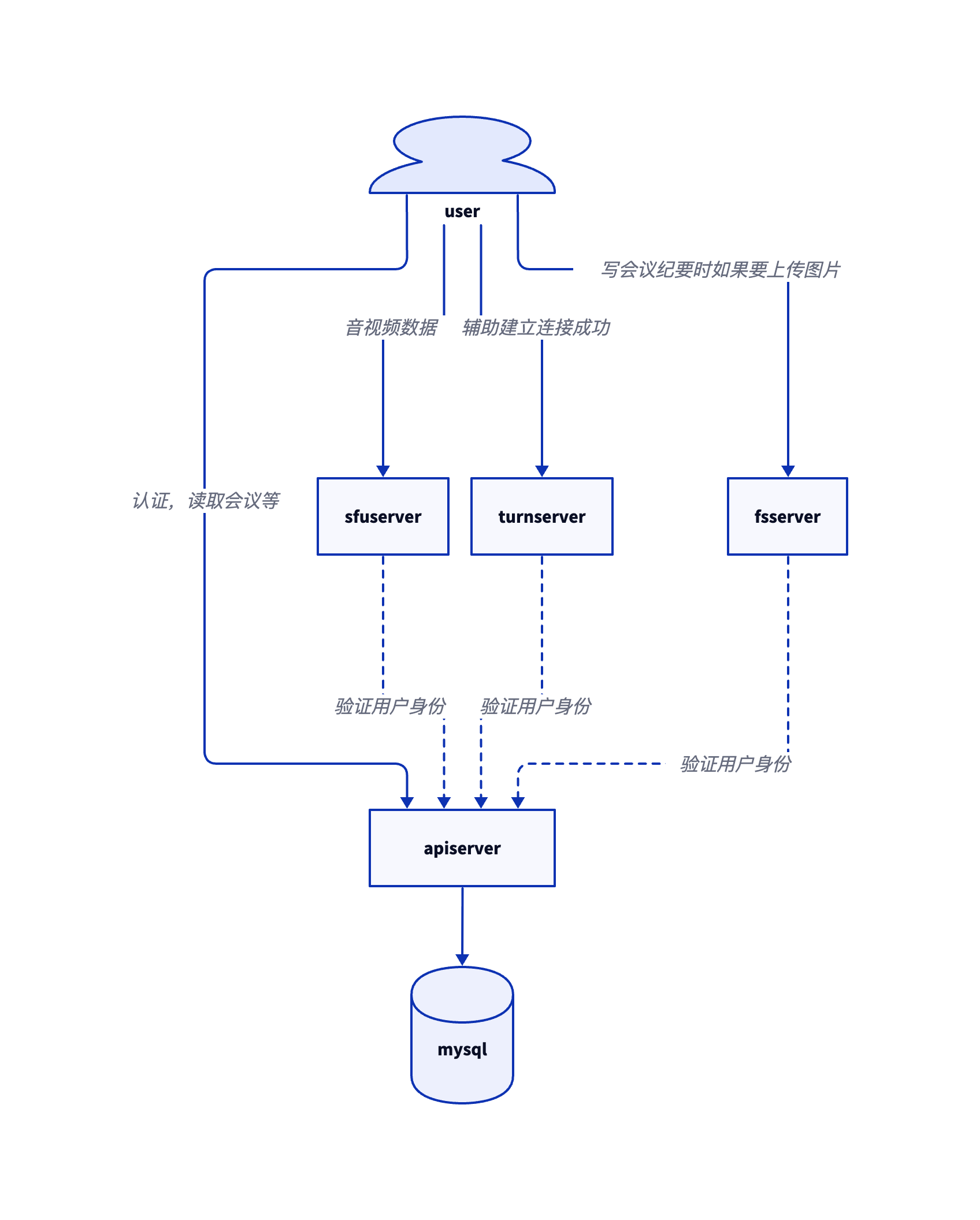 apiserver: Acts as the hub of the entire Meeting. It needs to connect to a mysql database and has low server requirements. The static binary has no dependencies and can be deployed with a single line of command.sfuserver: Acts as a relay for audio and video. It needs to connect toapiserverand has high server requirements. The static binary has no dependencies and can be deployed with a single line of command.turnserver: Acts as a role to ensure successful user connection to the meeting. It needs to connect toapiserverand theoretically has low server requirements. The static binary has no dependencies and can be deployed with a single line of command.fsserver: Acts as a storage role for writing meeting minutes images or files. It needs to connect toapiserverand has low server requirements. The static binary has no dependencies and can be deployed with a single line of command.allocateserver: When a user connects toapiserverto create a meeting,apiserverwill requestallocateserverto allocate for the meeting:sfuserver,turnserver,fsserver. Requires simple development by the enterprise to implement its own allocation strategy.