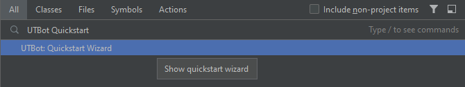 To launch the UTBot Quickstart wizard, go to Navigate > Search Everywhere and enter UTBot Quickstart. Click on it.