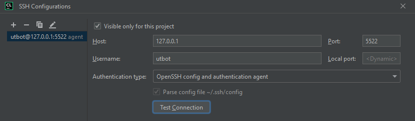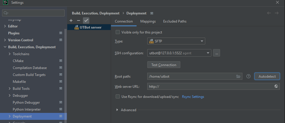 If the UnitTestBot C/C++ server and the CLion plugin are installed on different machines, or the server is installed via Docker, you have to use the Deployment feature.