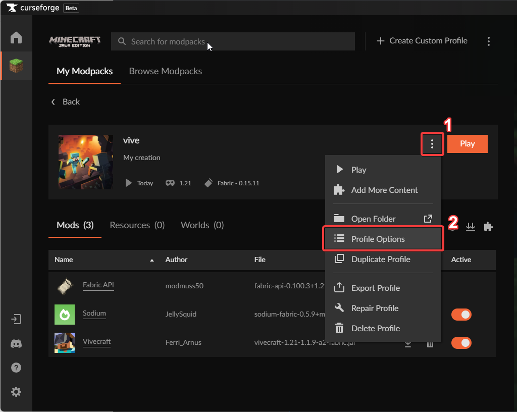To set the memory and garbage collector settings on the CurseForge app, select the desired modpack instance (click the image, not "Play") and follow these steps: