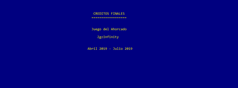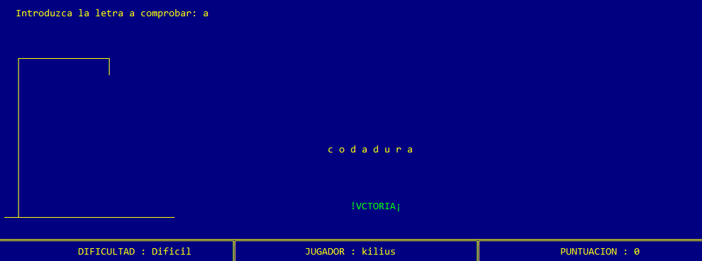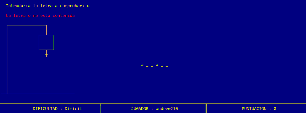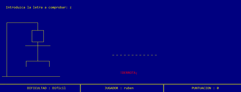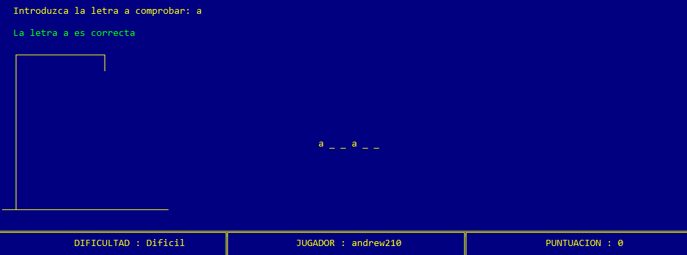 Una vez introducidos los datos de juego, la máquina selecciona una palabra aleatoria del castellano, sin tildes y sin eñes, mostrando por cada letra un guión bajo o underscore. Al mismo tiempo se dibuja una ahorca donde se irán dibujando las diferentes partes del muñeco según el usuario vaya fallando al probar letras de la palabra. Además, en la parte inferior de la pantalla se muestra un panel de información donde se recoge la dificultad de la partida, el jugador que juega y la puntuación que lleva ganada hasta el momento. La siguiente imagen muestra la apariencia que tiene la pantalla de juego.