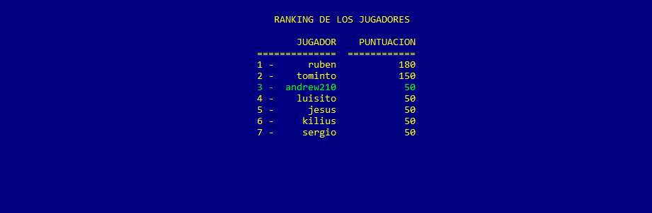 Tras dar la orden de que no se desea volver a jugar, se muestra una tabla informativa con los datos de todos los jugadores que están registrados en ese momento. Para cada usuario se muestra su nombre y la puntuación. El jugador que ha terminado de jugar aparece puesto en la clasificación con un color diferente al resto para poder facilitar que éste se encuentre con mayor facilidad. Los jugadores aparecen ordenados por orden decreciente de puntos de modo que el más alto se encuentra en la primera posición y el peor en la última. Seguidamente se muestra una captura de una clasificación de ejemplo.