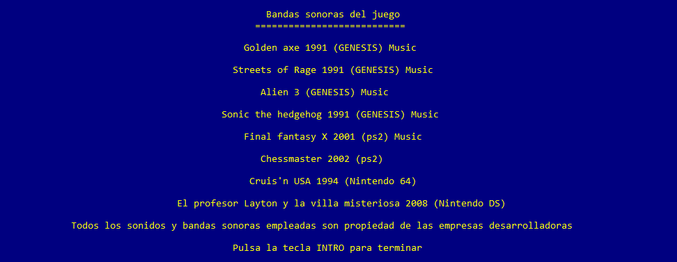 Finalmente se muestra una sección de agradecimientos y crédutos donde figura el nombre del juego, el tiempo de su desarrollo y el creador. Adicionalmente se muestran los diferentes juegos, así como la plataforma para la que salieron, a los que pertenecen los efectos de sonido y bandas sonoras que se han empleado en la implementación del juego. A continuación se muestran dos imágenes donde se puede observar lo explicado anteriormente.