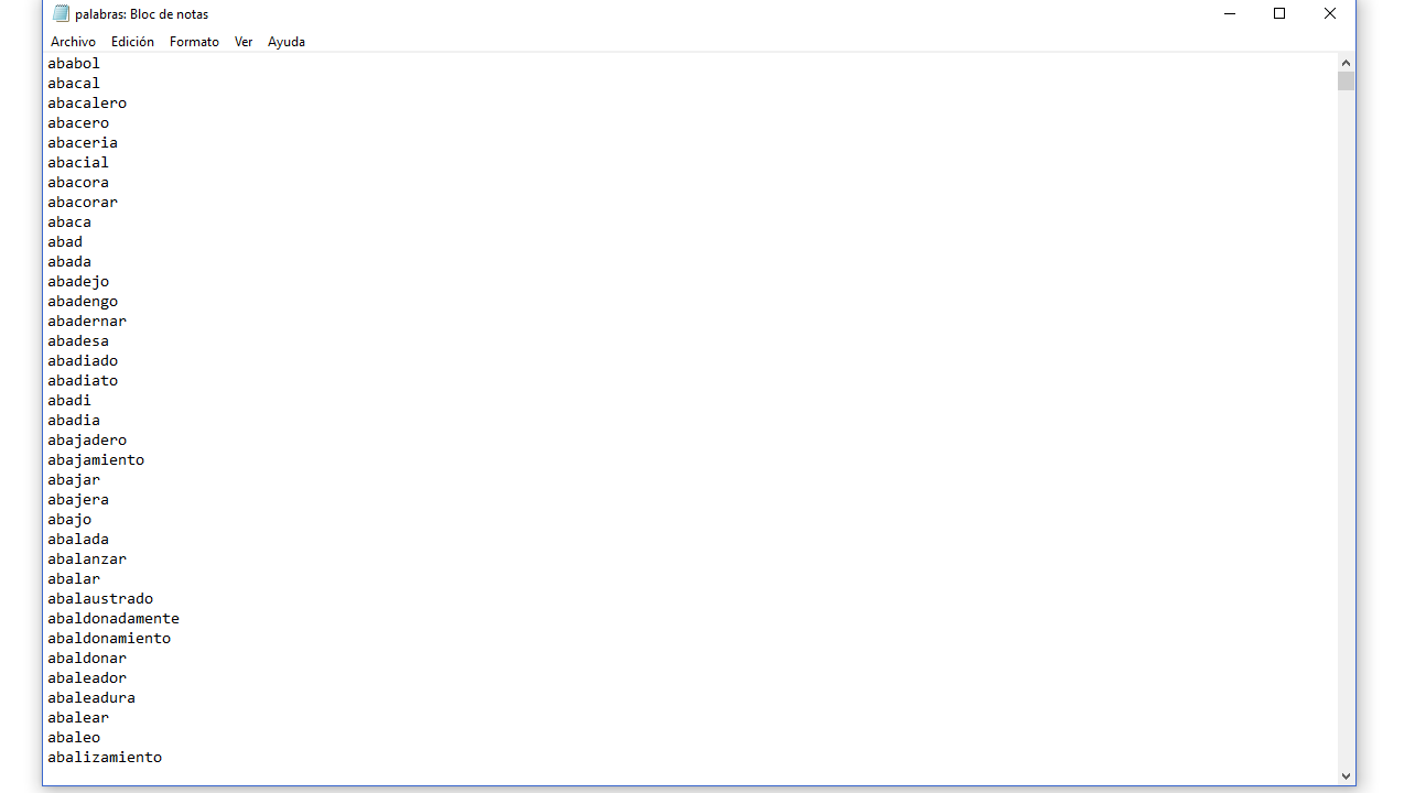 Esta versión del Ahorcado solo trabaja con palabras del lenguaje castellano, de las que se han eliminado todas aquellas que tienen tildes en vocales o que contienen la letra eñe. Las palabras se encuentran almacenadas en un fichero binario porque así la selección de la palabra se hace de forma más eficiente. Dicho fichero se denomina "palabras_bin.bin", que es generado a su vez de otro fichero de texto denominado "palabras.txt" que almacena las palabras del castellano descritas anteriormente, a razón de una por línea, tal y como muestra la siguiente imagen.
