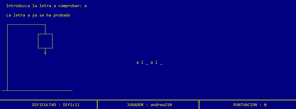 El usuario debe introducir la letra con la que desea probar suerte a través del teclado. Posteriormente se procede a verificar si esa letra reside o no en la palabra. Si la letra figura en la palabra, se muestra un mensaje en verde afirmandolo, y acto seguido se sustituyen las rayas bajas o underscores por las letra en cuestión. Si la letra no está, se muestra en rojo un mensaje en cuestión informando del error al usuario y se dibuja la parte del muñeco que corresponda en la ahorca. No obstante, si la letra ya ha sido probada antes muestra un mensaje informando de ello y se limita a pedir otra letra de nuevo. A continuación se muestran tres capturas para evidenciar la retroalimentación anterior.
