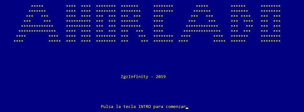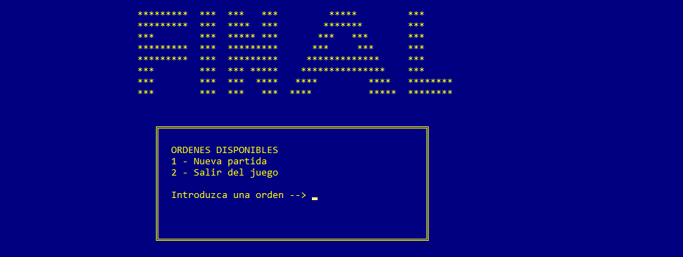 Al arrancar el juego, comienza saliendo el menú principal donde se detalla el nombre del juego, el desarrollador y el año correspondiente a la fecha de desarrollo. Posteriormente, se muesra un mensaje al usuario para que presione la tecla INTRO para poder continuar. El juego permanece en ese menú hasta que el usuario presiona dicha tecla. A continuación se muestra una captura de la apariencia que tiene el menú principal.