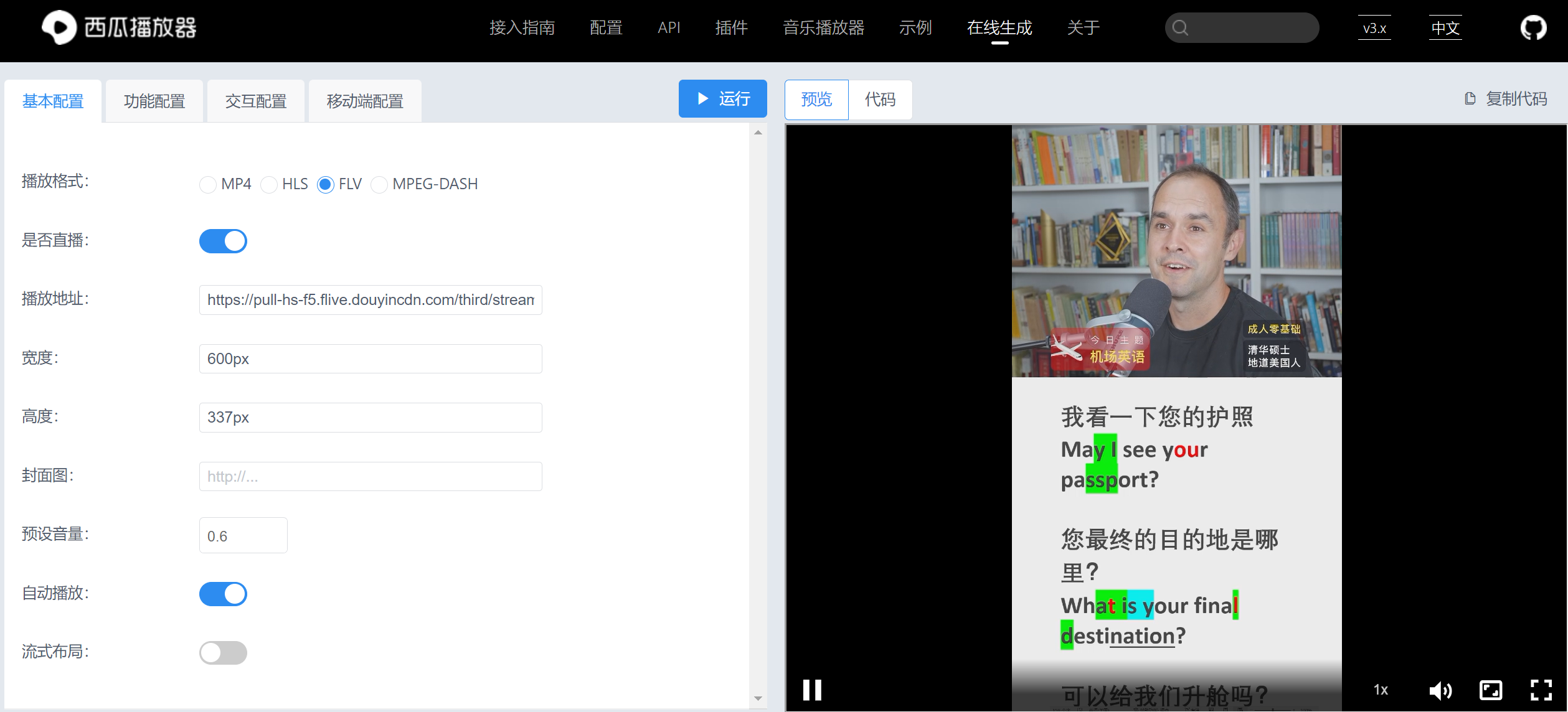 西瓜播放器(支持flv直播流):https://h5player.bytedance.com/generate/