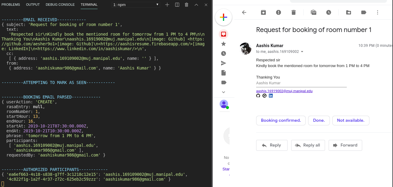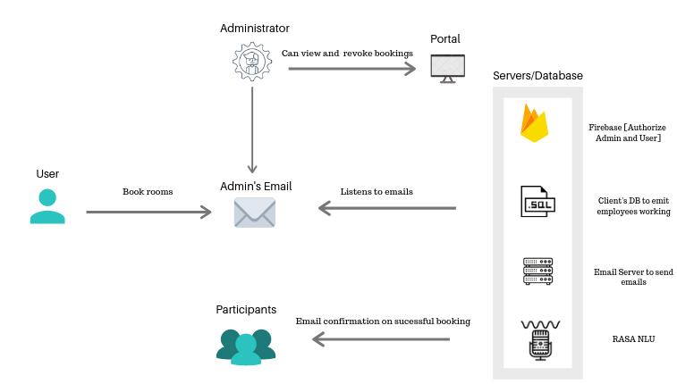 An IMAP Webhook that listens to emails (tested on gmail) and sends the query to RASA server, the server parses the texts, emits the actions and then contacts the client_server to check if the participants are valid, finally booking is done