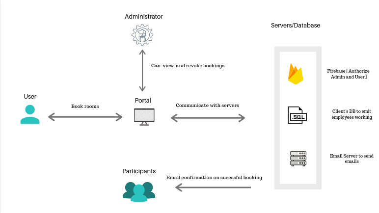 A normal portal which connects to 2 Databases 1 the room booking database and the other the client's employee database. You can mitigate a server by using just one database though.
