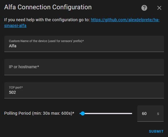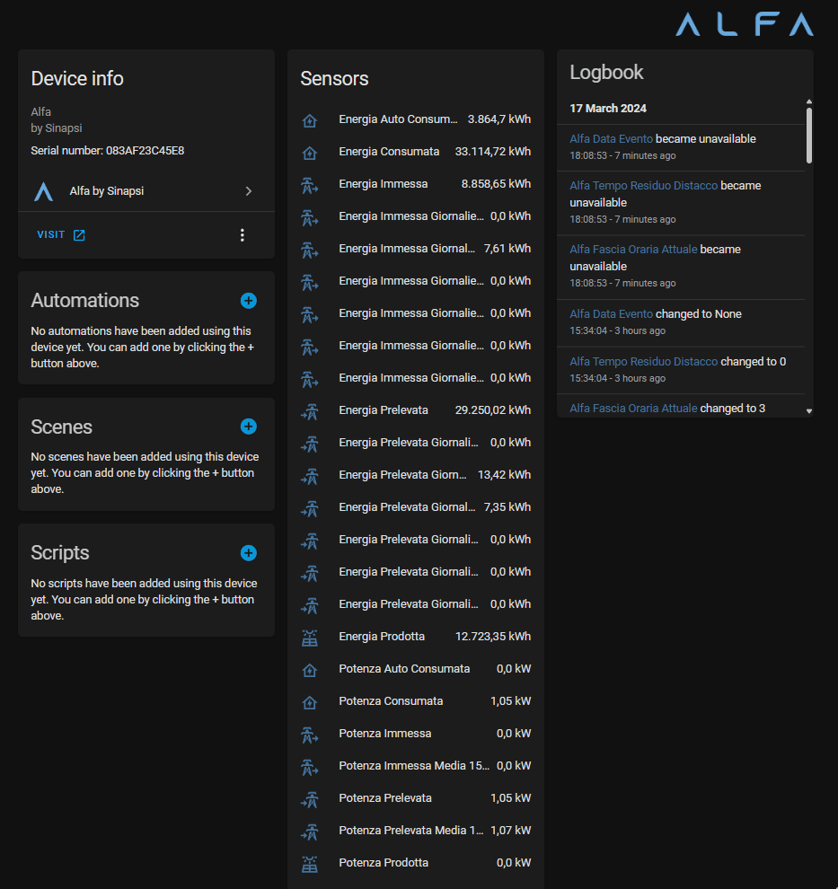 HA Custom Component to integrate data from Sinapsi Alfa device. Tested on my Alfa to monitor the power/energy consumption and photovoltaic power/energy production directly from the energy provider's OpenMeter 2.0.
