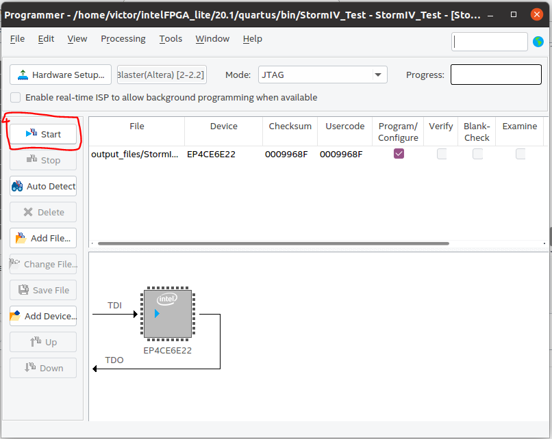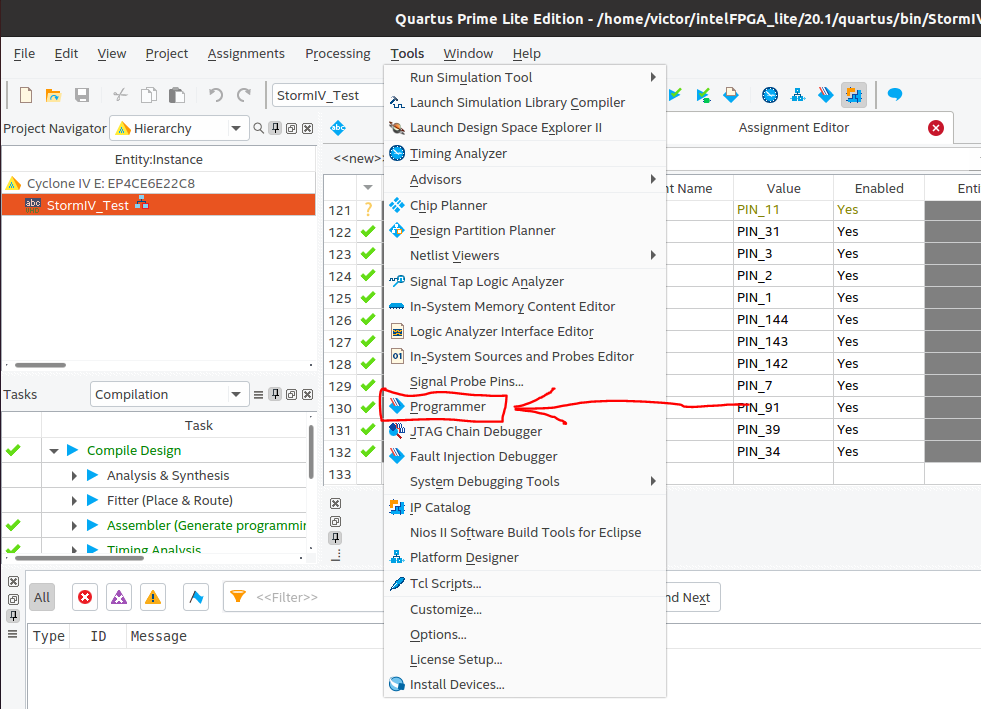 If the whole process went well, we should see a Compile design check mark, this indicates that we can program the FPGA with the code.