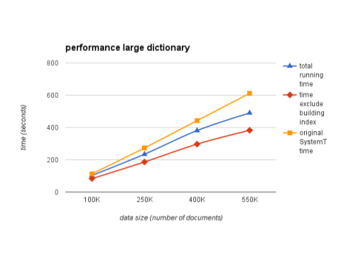 Here's the performance result of a small dictionary of 460 entries. Using Lucene for preprocessing is constantly a lot faster than the original SystemT.