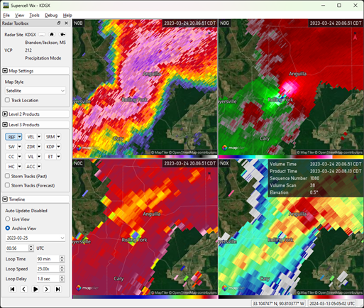 Supercell Wx is a free, open source application to visualize live and archive NEXRAD Level 2 and Level 3 data, and severe weather alerts. It displays continuously updating weather data on top of a responsive map, providing the capability to monitor weather events using reflectivity, velocity, and other products.