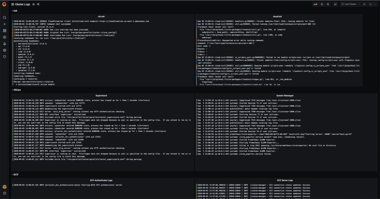 - Cluster Logs - This dashboard shows all the logs of your HPC Cluster. The logs are pushed by AWS ParallelCluster to AWS ClowdWatch Logs and finally reported here.