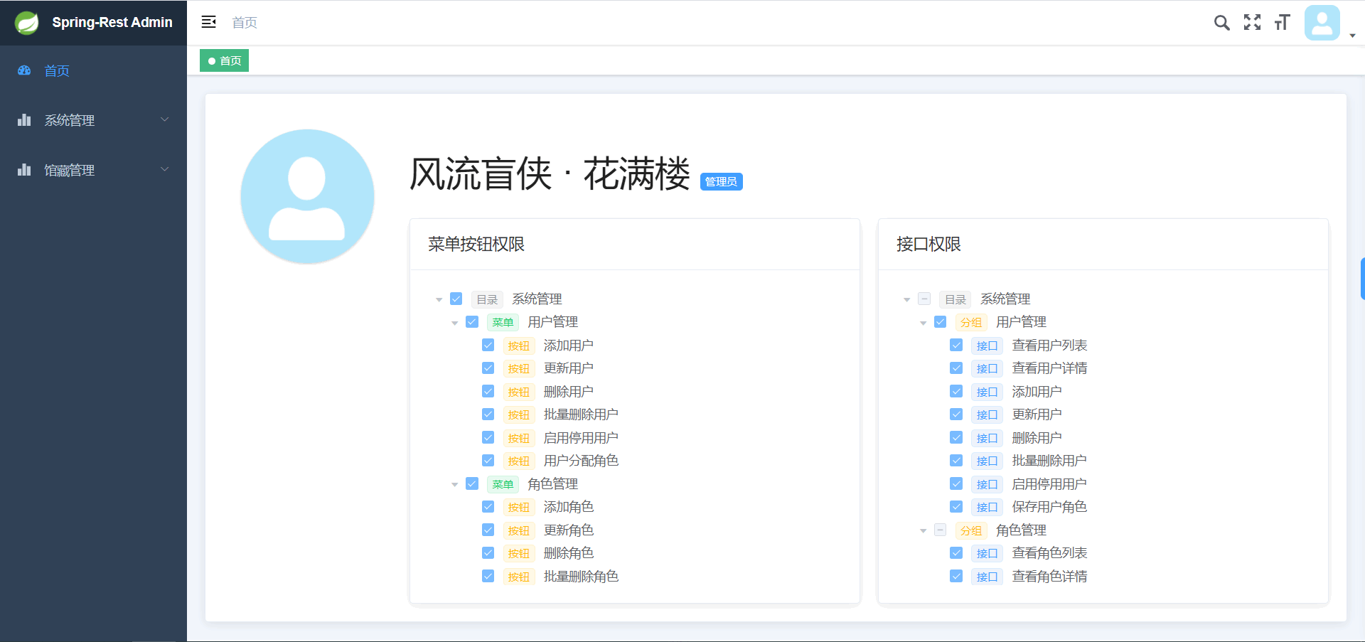 除按钮权限外,菜单权限、接口权限的元数据分别由前端和后端自动生成,即使数据库记录全部被清空,也只需要管理员再同步一次即可,无需手工插入表记录;