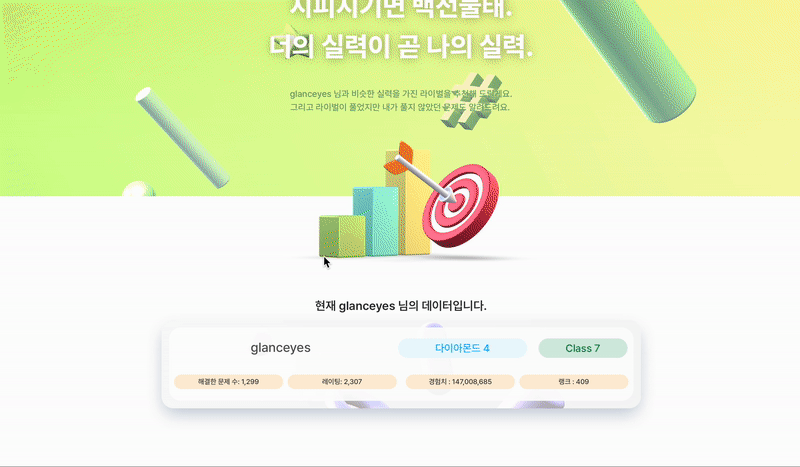유저의 레벨별 문제 풀이 이력과 티어, 클래스, 레이팅을 종합적으로 고려하여 해당 유저의 실력과 유사한 다른 유저들을 6명4 추천해드립니다.