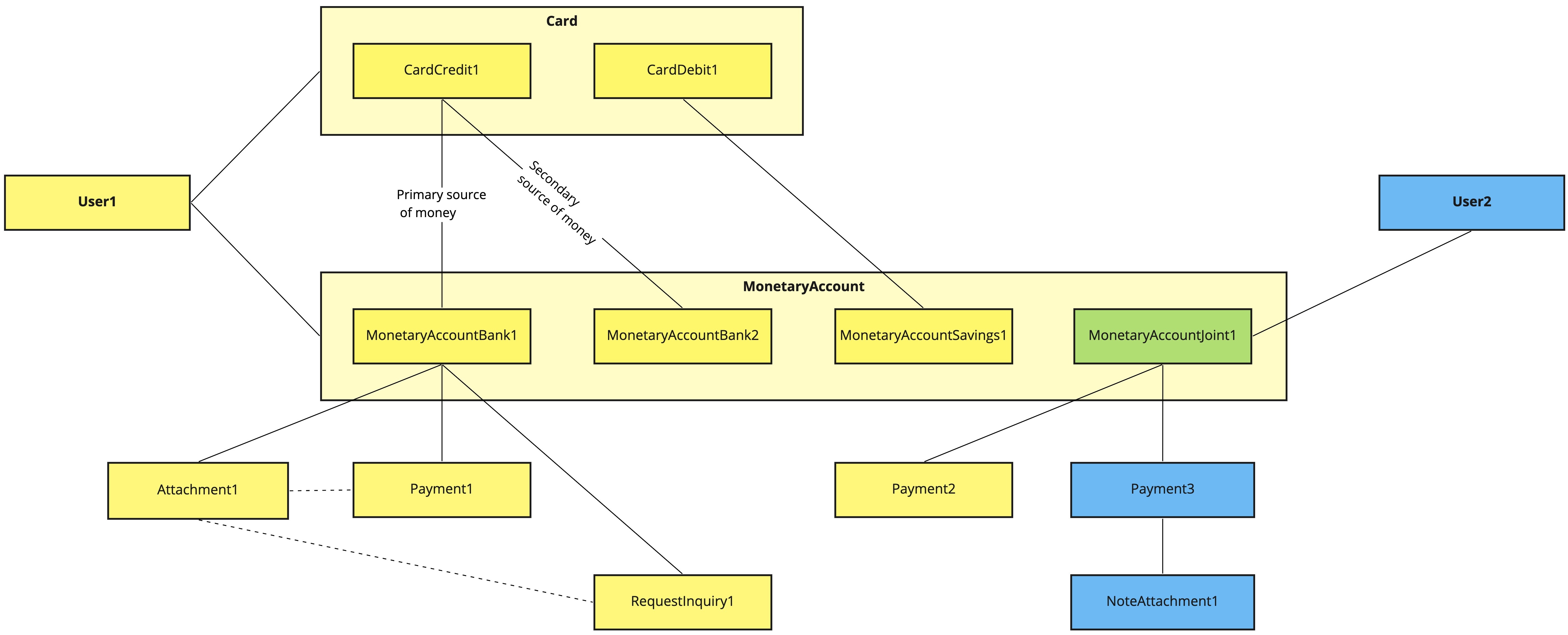 CardDebitsupports Maestro, MasterCard, Tap & Pay, and virtual cards. CardCredit, on the other hand, offers MasterCards of either MASTERCARD_TRAVEL or MASTERCARD_GREEN product types. All cards of the users are listable under Card.