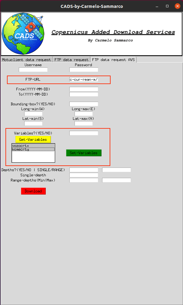 The program is divided into three tabs. The first tab is exslusively used by the motuclient download mechanisms while the second tab for the FTP download data request. The third tab it is just another experimental version of the FTP download data request showing another way to handle variables and a different database structure. Here below a description of each TABS: