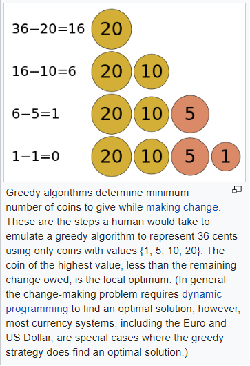 這個問題可以用『貪婪算法』,從小於『剩餘金額』的最大類型銅板開始找起,因為這樣找一個零錢就可以『解決最多的剩餘金額』,所以是一種貪婪策略!